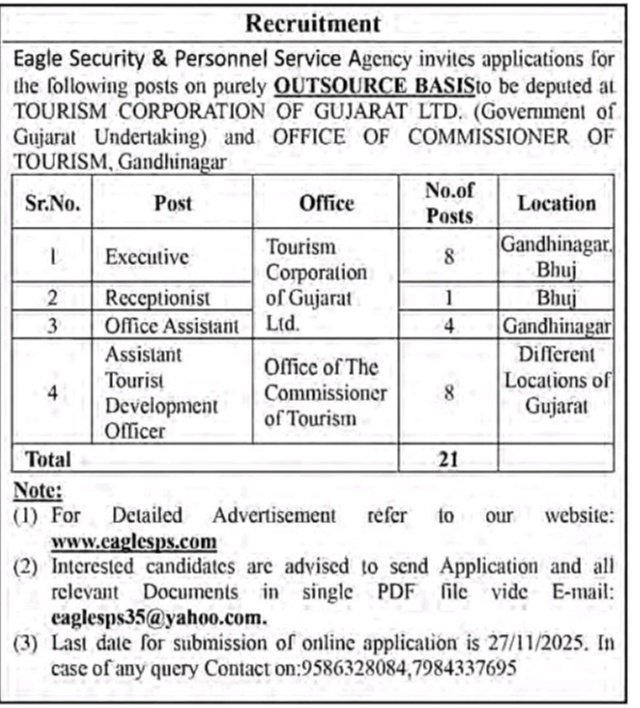 ESPSA Recruitment 2025: ઇગલ સિક્યોરિટી એન્ડ પર્સનલ સર્વિસ એજન્સી દ્વારા ગુજરાત સરકાર હેઠળ સુરક્ષા ટુરિઝમ કોર્પોરેશન ઓફ ગુજરાત લિમિટેડ. આ ભરતી રાજ્યના વિવિધ વર્ણના એક્ઝિક્યુટિવ્સ, રિસેપ્શનિસ્ટ, ઓફિસ આસિસ્ટન્ટ અથવા આસિસ્ટન્ટ ટુરિસ્ટ ડેવલપમેન્ટ ઓફિસર જેવી પદો પર યોગ્ય પસંદગી કરી ને નોકરી આપવામાં આવે છે. પર્યટન વિભાગ હેઠળ કાર્ય કરવાની આ તક માટે સ્થાનિક પ્રોજેક્ટમાં ઉત્તમ કારકિર્દી બનાવવાની શ્રેષ્ઠ તક પૂરી પાડે છે.