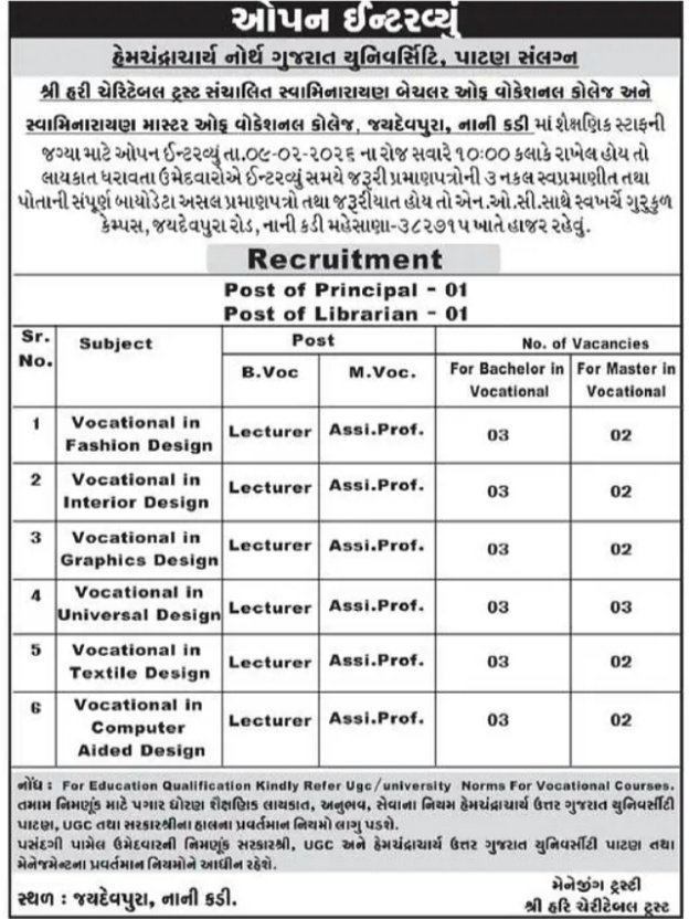 શૈક્ષણિક ક્ષેત્રમાં કારકિર્દી બનાવવાની ઇચ્છા રાખતા પ્રતિભાશાળી ઉમેદવારો માટે એક સુવર્ણાવકાશ ઉભો થયો છે. હેમચંદ્રાચાર્ય નોર્થ ગુજરાત યુનિવર્સિટી, પાટણ સાથે સંલગ્ન શ્રી હરી ચેરિટેબલ ટ્રસ્ટ દ્વારા સંચાલિત સ્વામિનારાયણ બેચલર ઓફ વોકેશનલ કોલેજ અને સ્વામિનારાયણ માસ્ટર ઓફ વોકેશનલ કોલેજ, જયદેવપુરા ખાતે વિવિધ શૈક્ષણિક પદો માટે ખુલ્લી ભરતી જાહેર થઈ છે.
